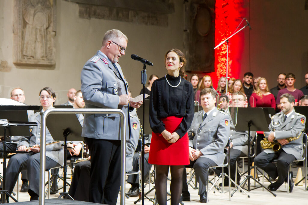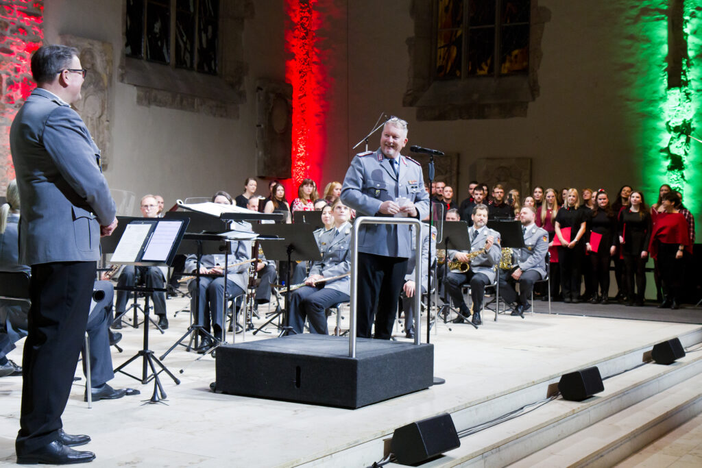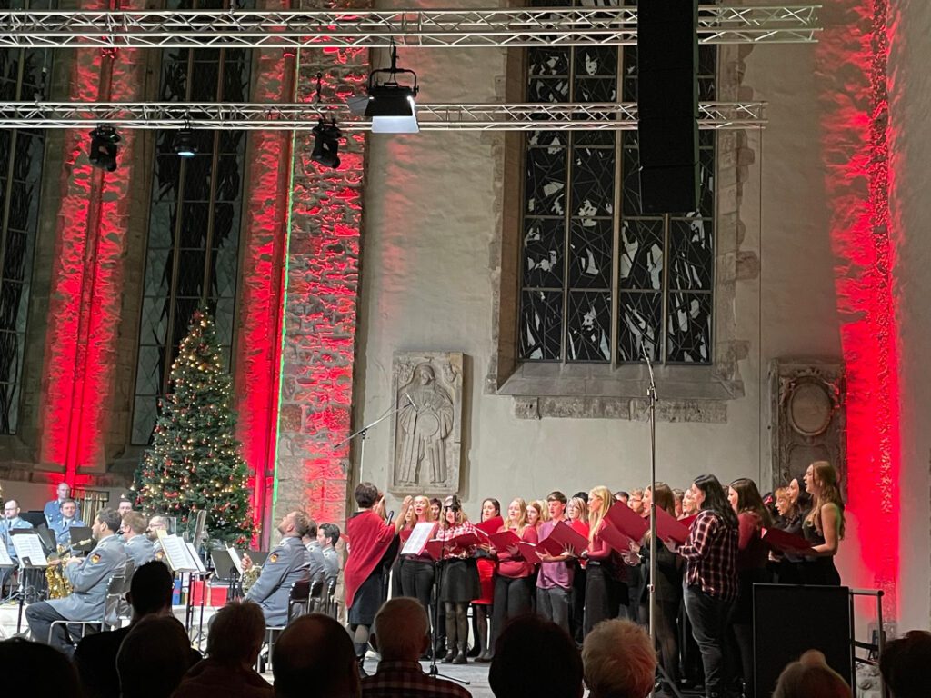 Am Dienstag hatte unser Projektchor seinen großen Auftritt mit dem Heeresmusikkorps Hannover unter der Leitung von Oberstleutnant Wehn. Mit viel Aufregung und Vorfreude haben wir diese Herausforderung unter der Leitung von Frau Gremmes gemeistert. Es war eine tolle weihnachtliche Atmosphäre, die uns als Chor und das Publikum verzaubert hat. Im Publikum saßen nicht nur viele Familienangehörige, Freunde und Kollegen, sondern auch unsere Oberbürgermeisterin Simone Borris, Oberstleutnant Alme, Frau Eggert aus dem Sozialministerium und Frau Dr. Kirstein vom Statdelternrat. Unser Auftritt wurde mit viel Applaus bedacht und für die Kürze der Vorbereitungszeit sehr gelobt. Vielleicht machen wir an der Stelle mit unserer Chorarbeit weiter?